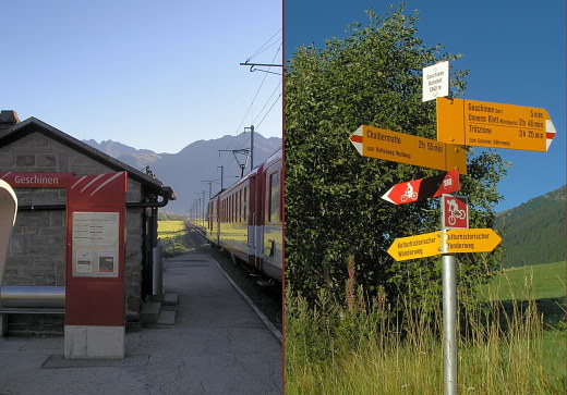 Beim Ladustafel ist eine Haltestelle für den Postbus vom Nufenen nach Ulrichen. Doch für den Kurs *151* um 17:55 ist [R] Reservation obligatorisch, (für mindestens 10 Personen), das heisst also: für Einzelwanderer gibt es kein Bus. So darf ich noch weiter hinunter laufen auf schönem Weg nach Ulrichen. | ||||||||||||||||||||||||||||||||||||||||||||||||||||||||||||||||||||||||||||||||||||||||||||||||||||||||