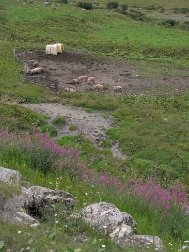 28.08.2012: Noch blüht es beim Lengtalstafel, weiter hinunter zum Ladstafel . Dort ist die Sennerei für die umliegenden 3 Alpen, - die Alpen-Schweine freuen sich an Freiluft und über die Abfall-Molke. - Die alte Brücke von 1761 beim Ladstafel | ||||||||||||||||||||||||||||||||||||||||||||||||||||||||||||||||||||||||||||||||||||||||||||||||||||||||