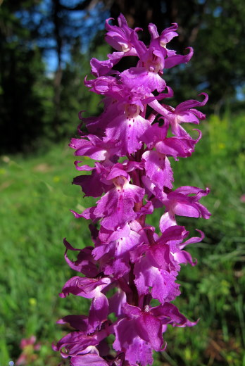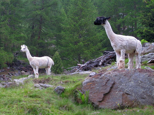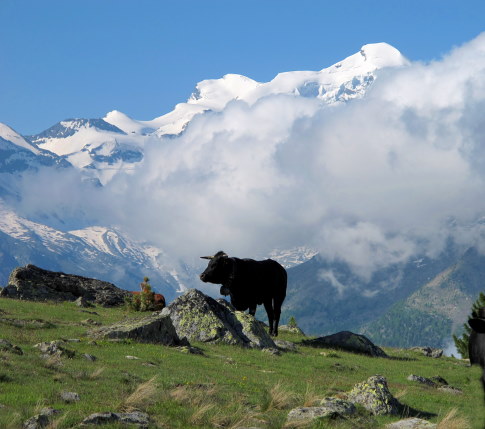 05.07.2013: Auf Matt weiden frisch geschorene Alpaka. * Männliches (?) Knabenkraut unter dem Siwibode. Auf Siwibode grasen Eringer, haben die auch *Ferienstimmung* ? Vom Siwibode aus schaue ich zum Mattwaldhorn, Nebelfetzen ziehen herum, aber der Aufstieg scheint heute möglich zu sein. |