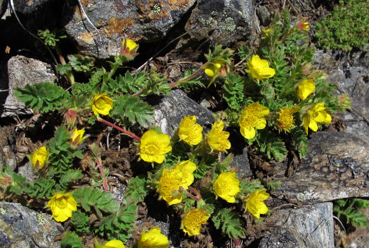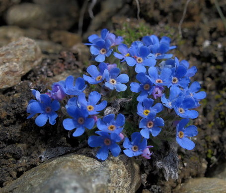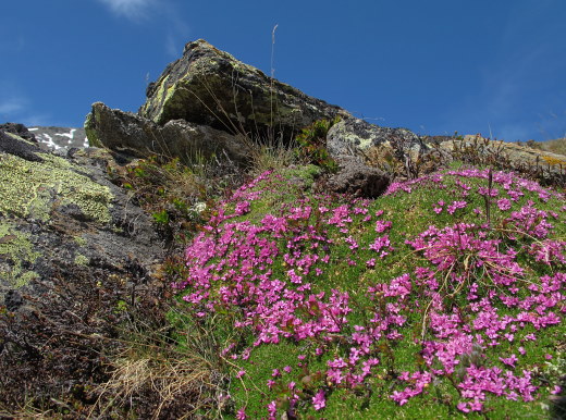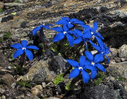 05.07.2013: Wunderbar blühr es auf der Mattwaldalp: Himmelsherold, Kriechender Berg Nelkenwurz, kleine Enziane und Hoppes Felsenblümchen . blau neben blau , gelb neben gelb. | |