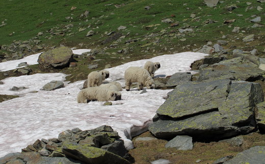12.07.2013: Anfang der Woche hat ein Wolf (?) Schafe im oberen Nanztal gerissen,  nun weiden sie unruhig, dicht gedrängt, etwas geschützt zwischen 2 Bächen. |
