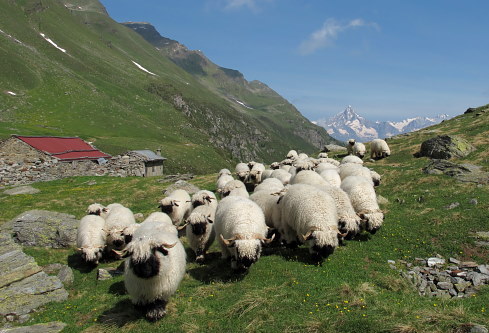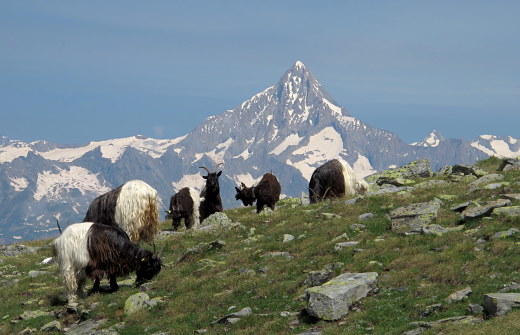 12.07.2013: Auch berggängige Schwarzhalsgeissen,  westlich vom Sirwoltesattel, erfreuen sich am Bietschhorn. |  |  |