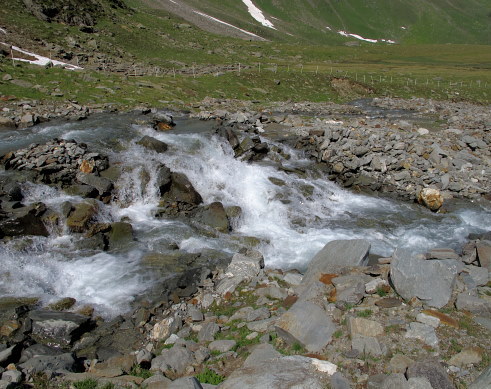 12.07.2013: An einer  etwas  flachen Stelle,  zwischen den Wasserfällen,  kann ich den östlichen Bach überqueren,  dann den steilen Grashang  hinauf,  bis  ich wieder zum markierten Weg,  von Obers Fulmoos, treffe.  Die  Rinnen sind  noch meist voller Schnee,  haben aber einige  alte  Spuren. |  |