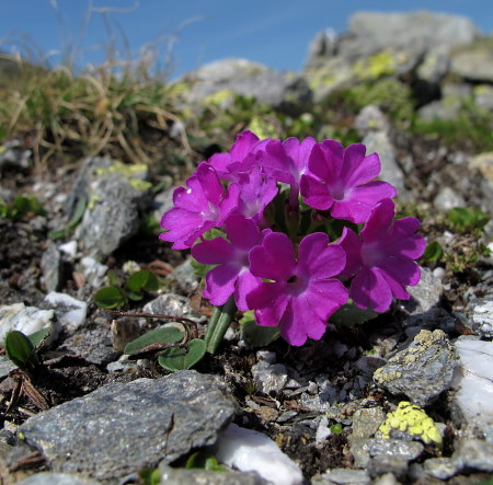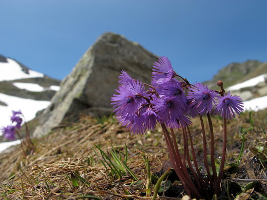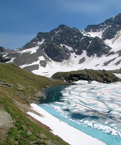12.07.2013: Noch fast  zugefroren ist   der  Sirwoltesee.  Dann Abstieg, zuerst  über markierte Geröllhaden,  dann immer mehr Blumen . |