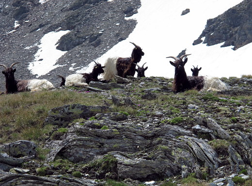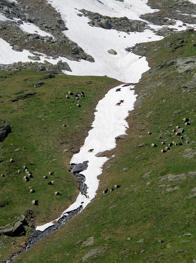 12.07.2013: Auf  der Ostseite  vom Sirwoltesattel (P.2621),  auf 2600 m, eine andere muntere Geissenschar,  die später über steile Schnee-)und Gras-Hänge absteigt,  offensichtlich aus reiner *Berg-Freude* |  |