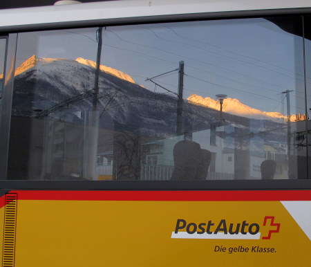 06.02.2014: Schon in Visp hat das Postauto den Sonnenaufgang eingefangen. | |