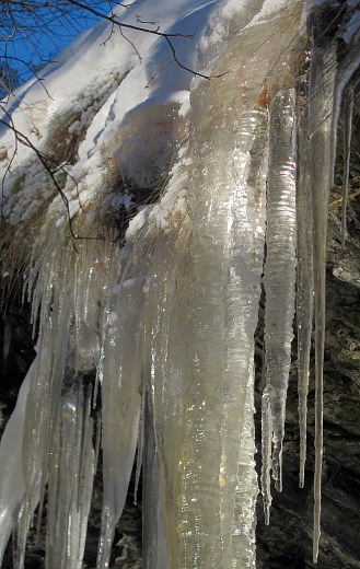 06.02.2014: Schon kurz nach der Postauto-Haltestelle (Tola ) konnte man die Schneeschuhe anlegen. Über dem Nadelgrat wird de Schnee aufgewirbelt, -> Vor Dipja : Eiszapfen hängen am Felsen.-> | |