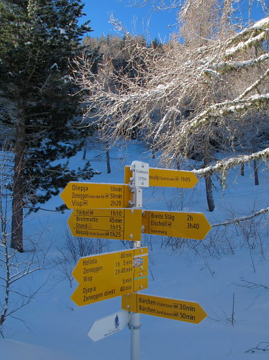 Mal wieder eine Standard-Wanderung: * Zeneggen - Diepja - Stand - Moosalp - Törbel. * Im Gebiet zwischen Zeneggen, Stand (2122m), Moosalp und Bürchen hat es zahlreiche Schneeschuh-Trails, und wenn man an sonnigenTagen dort unterwegs ist, darf man nicht damit rechnen, alleine zu sein. |
