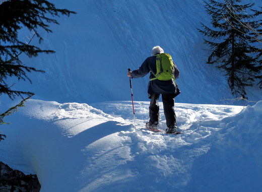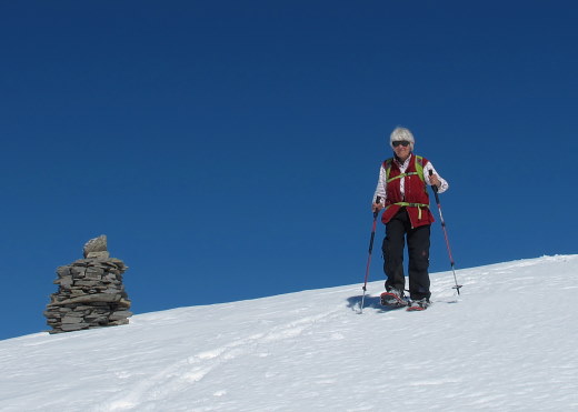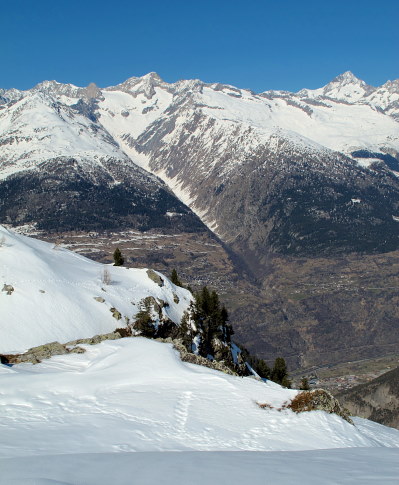 Erstaunlich viel Schnee liegt noch oberhalb von Visperterminen, schon beim Dorfausgang können wir die Schneeschuhe anlegen, noch lange ist der Schnee gut hart, ab P.1834 m hat es durch den Wald hinauf gute Spuren. Nur der vorletzte Aufstieg zum Sender ist steil und hart. Weil es noch so schön ist, machen wir einen Abstecher zum Chrizerhorlini. Dann über Giw den Wald hinunter nach Visperterminen