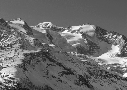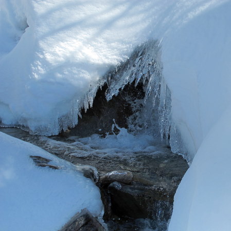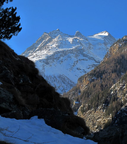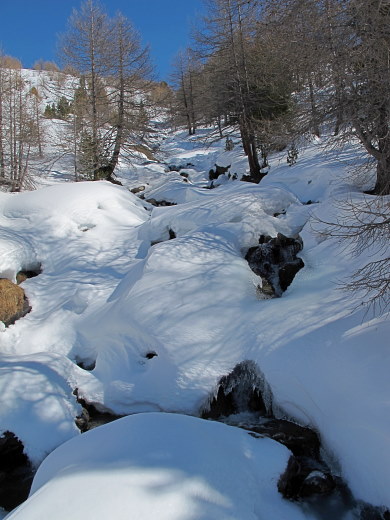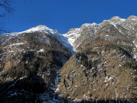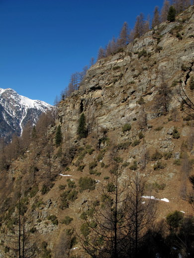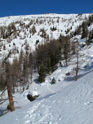 13.03.2015: <- Alp Schweibu, darüber der Balfrin. Der steile Pfad von Stellinu hinauf zum Leidbach-Pfad ist gut erkennbar, ? alte Schneeschuhspuren ? Dann kommt man,vor dem Ahornbach, sonnigen Teilstück, das immer wiede zur Rast einläd. Der Ahornbach lässt sich auch mit Schneeschuhen gut queren, doch dann auf der Schattenseite liegt mehr Schnee, den freundliche Gämsen für mich vorgespurt haben. |