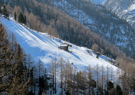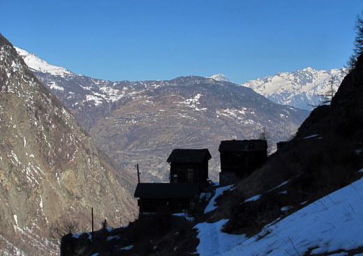 13.03.2015: Beim Start in Eistenbin ich noch im Schatten, aber die gegenüberliegende Seite liegt schon in der Sonne. Nach Asp lege ich die Schneeschuhe an, am Anfang hat es immer wieder schneefreie Abschnitte. * Die Hütten von Stellinu. | |