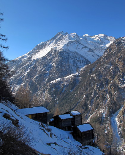 Schon oft sind wir im Winter mit Schneeschuhen von Eisten über Stellinu zum Bachalpji gelaufen, dieses Jahr erst im Vorfrühling, alleine, weil es für Rosmarie zu viel schien. Den ganzen Tag, zwischen Eisten und Saas Balen, bin ich keinem Menschen begegnet. |