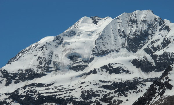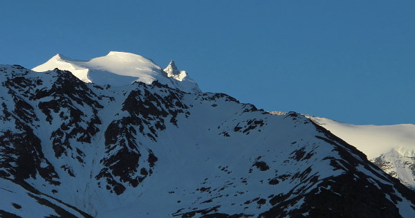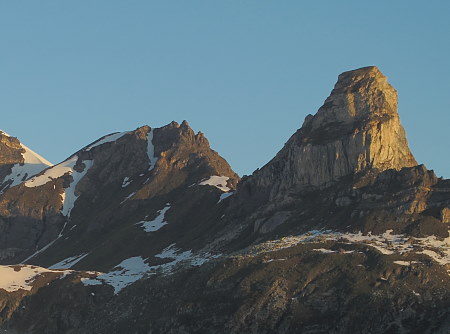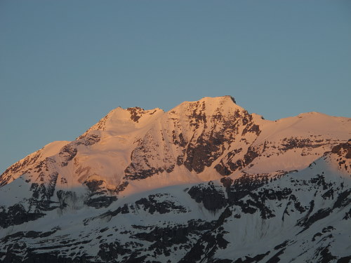 04.06.2015: Bishorn und Weisshorn sind schon in der Sonne, davor die Langi Egga. Auch nach Gigi-Oberstafel brauchen wir dort, wo es vor einer Woche hart gefroren war, noch keine Schneeschuhe, dort kommen auch wir in die Sonne. |