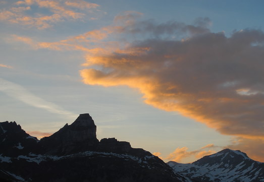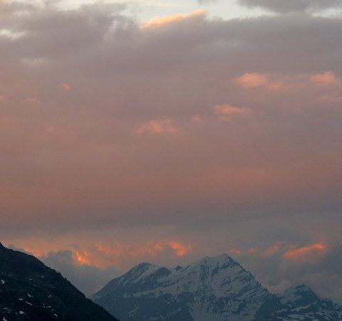 03.06.2015: Am Abend kommt im Norden, über dem Rhonetal, Gewitterstimmung auf, am nächsten Morgen hat es, anders als vor 1 Woche, vor der Hütte, keinen Frost mehr, der Schnee ist schon weich. |