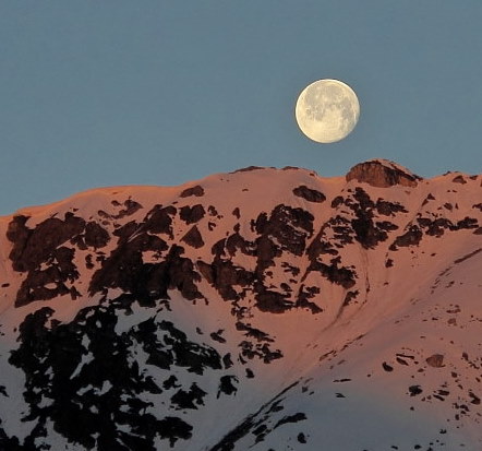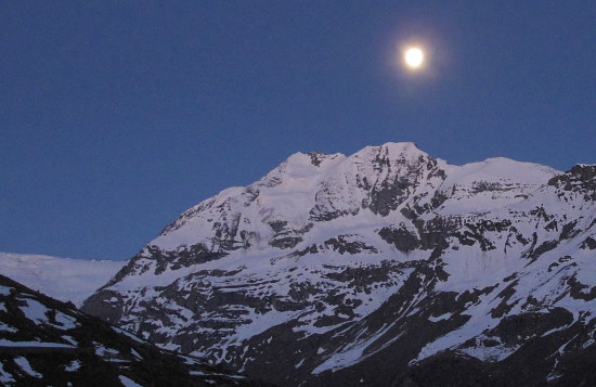 04.06.2015: Tagwacht um 04:00, noch scheint nur der Vollmond. -> weil ein heisser Tag erwartet wird, starten wir schon vor Sonnenaufgang und erleben bald Sonnenaufgang + Monduntergang. |