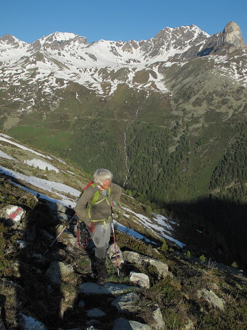 Als wir letzte Woche übern den *Alten Talweg* abstiegen, hatten wir unsere Schneeschuhe oben gelassen. Für die nächsten Tage ist heisses Sommerwetter vorhergesagt. In unserem kleinen Gärtchen auf 2300 m pflanzen wir Salatstzlinge. Am nächsten Tag wollen wir früh starten Richtung Augstbordpass |