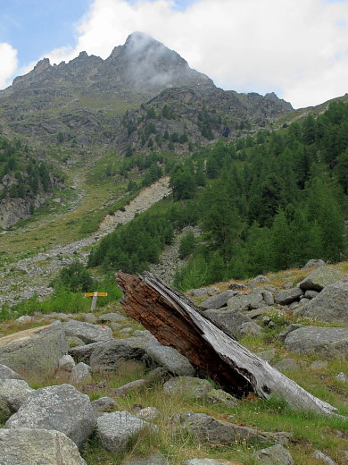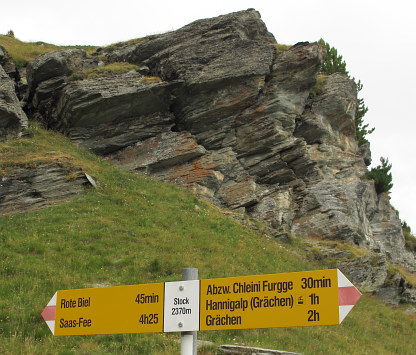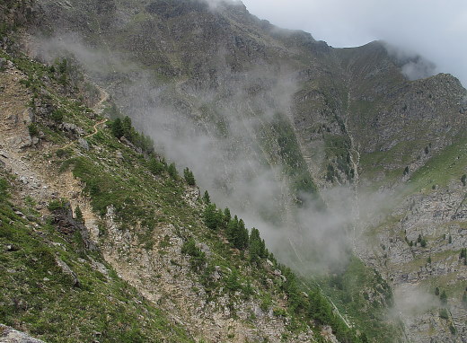 Vor 1 Woche waren wir auf der  weniger begangenen rechten Saastalseite unterweg. Von Huteggen/Eisten laufen wir hinauf zur Schweibenbach-Brücke, der Mitte vom  Höhenweg Saas_Fee -> Grächen. Nebelfetzen ziehen durchs  Tal, aber man läuft angenehmer als in der Sonnenhitze. Der Höhenweg ist gut markiert und meist gut gesichert, verlangt aber oft Trittsicherheit,  wir Senioren brauchen länger als die angegebenen Zeiten. |
