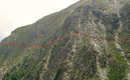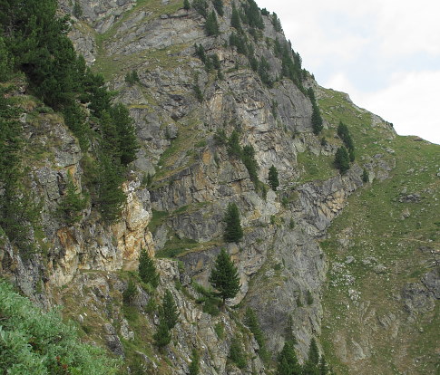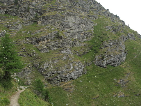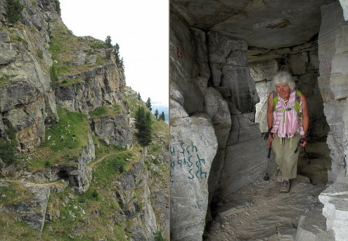 23.07.2015: Ein kurzer Tunnel am Weg, -> Auf der anderenTalseite: Alp Stellinu ,  Zer Matte, Schopfine. -> * unten: oft führt der Pfad (Bildmitte) gesichert durch steile, stabile Felsen. |  |