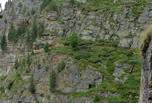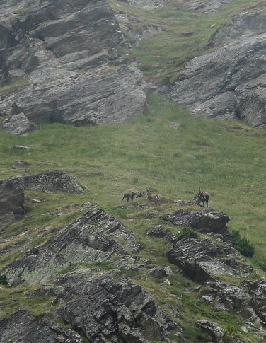23.07.2015: Weit oberhalb vom Wanderweg  ruhen Steinböcke auf nebligen Felsen. |  |