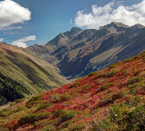 24.09.2016: Leuchtende Heidelbeer-Stauden über dem Rappental, im Aufstieg zum Eggerhorn. * <- Alte Alphütte oberhalb Frid * <== Silberwurz, verblüht, am steilen Hang , und immer noch schön anzusehen. | |