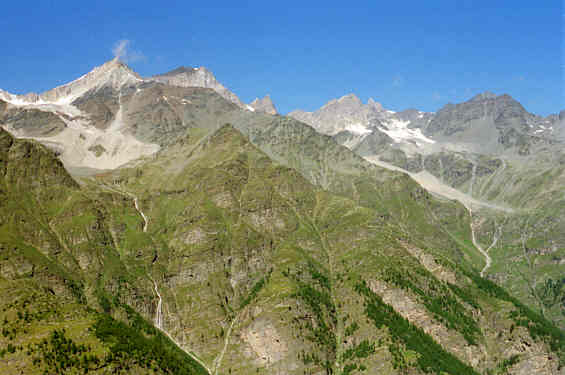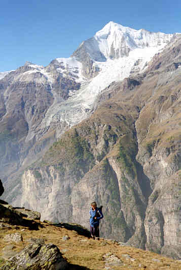 Die Gugla (3377m) liegt hoch über Herbriggen im Mattertal, Für den Aufstieg zum Gipfel man muss früh aufstehen, denn von Herbriggen über Geisstrift sind mehr als 2100 m Höhendifferenz zu überwinden. Bevor für den Europaweg die Abzweigung hinuner nach Herbriggen gebaut wurde, benutzten fast nur "Einheimische" den nur wenig markierten Pfad . Durch den Lärchenwald hinauf , hin und her über Felsbänder, trifft man mehr Steinböcke als Wanderer und kann immer wieder herrliche Blicke auf die genüberliegende Seite geniessen. Auch im heutigen Zustand ist die "Abkürzung" vom Europaweg nicht ein gemütlicher Abstieg für müde Wanderer. |