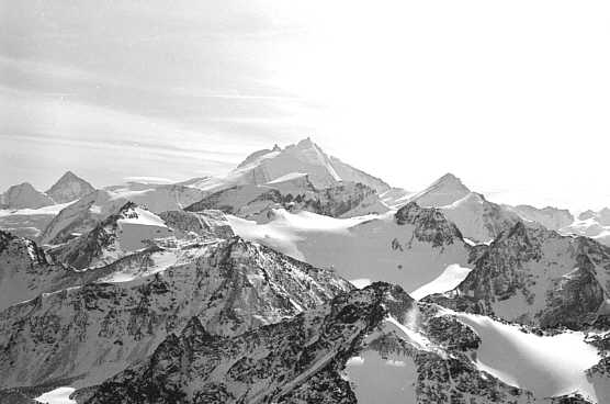 Blick vom Schwarzhorn nach Süden, gegen Brunegghorn, Bishorn, Wasenhorn, Rothorn. ¦ Oktober 1968, Ilford PanF.