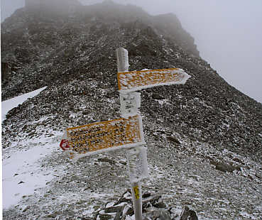 08.07.05: Die Wegweiser am Pass sind mit Reif bedeckt und von Westen her fegt ein kalter Wind. Eine Gruppe (8) von Wanderen hält sich nicht so lange oben auf. | |||||||||||||||||||||||||||||||||||||||||||||||||||||||||||||||||||||||||||||||||||||||||||||||