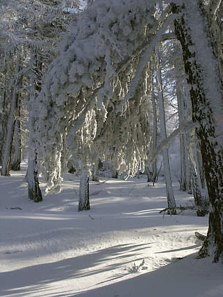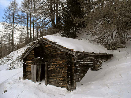 19.12.05: der Sturm hat den Schnee oben auf Gebidem weitflächig fortgeblasen, nun liegt lockerer Triebschnee im steilen Bergwald; das mahnt beim Abstieg zur Vorsicht. irgend ein Wildtier hat wohl vorübergehend in der alten Berghütte Unterschlupf gesucht. | |||||||||||||||||||||||||||||||||||||||||||||||||||||||||||||||||||||||||||||||||||||||||||||||||||