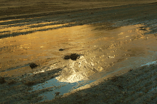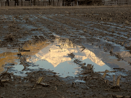 23.01.08: Im Talgrund bei Baltschieder taut der Boden langsam auf, Wassertümpel bilden sich und spiegeln die sonnigen Berge . |