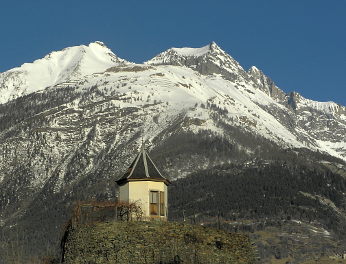 24.01.08: Altes Rebhäuschen in Visp, darüber Wiwannihorn . | |