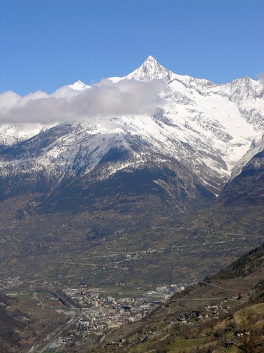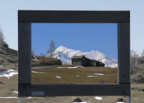 04.04.08: Nicht ais dem Rahmen gefallen bei Visperterminen . - Blick hinunter nach Visp und auf das Bietschhorn .-> | |