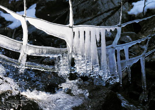 04.04.08: Nur für Augenblicke scheint die Sonne auf die Eiszapfen im Bächlein beim Weiler Birch . | |