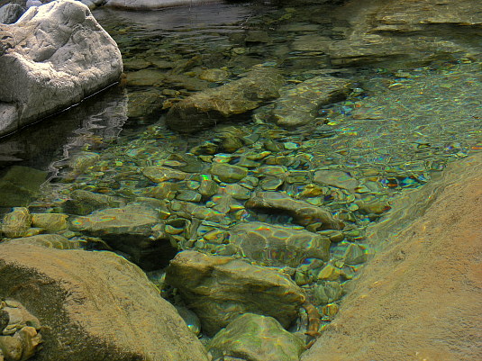 12.04.08: Die Turtmänna bei der Bärenpfad_Brücke führt noch wenig Wasser ; das Licht bricht sich im klaren Becken . |