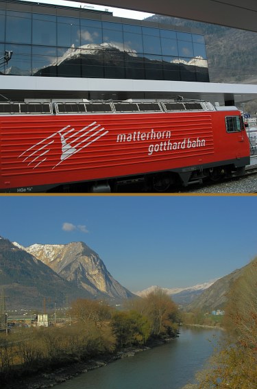 16.04.08: Mit der Bahn von Visp nach Turtmann. Auf dem Nachbargleis der Zug nach Zermatt. Das Wiwannihorn spiegelt sich in der neuen Bahnhof-Fassade . Die Rhone / der Rotten bei Turtmann; links der Illgraben . | |