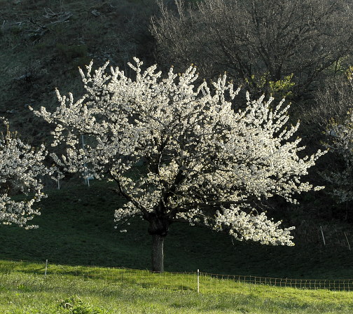 16.04.08: Die Morgensonne streift die blühenden Kirschbäume in Getwing . |