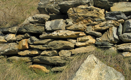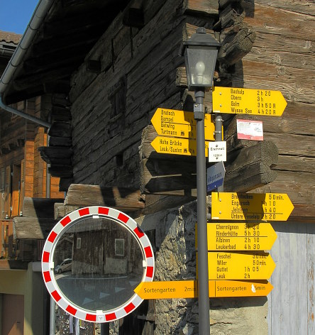 16.04.08: Steinmauern am Pfad nach Erschmatt. - Wegweiser in Erschmatt; wo geht es weiter ? -> |