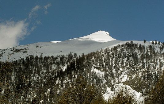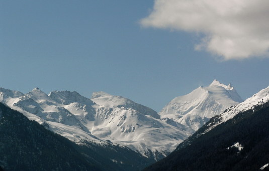 16.04.08: Blick hinüber in das noch winterliche Turtmanntal; hinten Bishorn und Weisshorn . | |