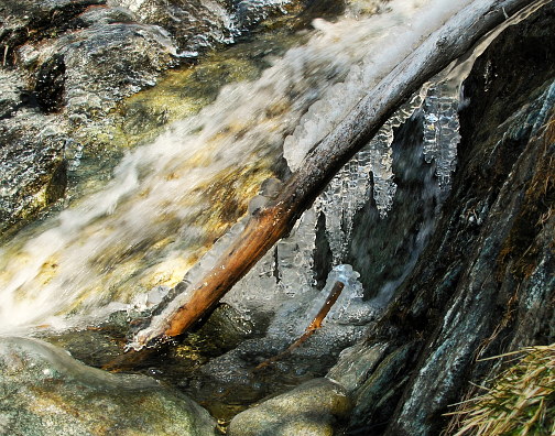 16.04.08: Oberhalb vom Weiler Bräntschu sind im Schatten Schnee und Wasser gefroren . Dann geht es den steilen, verschneiten Pfad hinunter über den Feschelbach . |