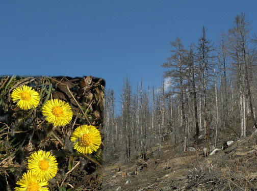 16.04.08: Von Guttet durch das Waldbrandgebiet von 2003 nach Albinen . Ein paar Huflattich leuchten im sonst noch toten Land. - Dorf Albinen vor dem Trubelstock . -> |