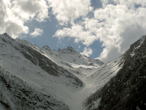 20.04.08: Wie vorhergesagt wird es am Mittag föhnig und bewölkt. Weiler Grossberg vor Gornergrat und Zermatter_Breithorn . |