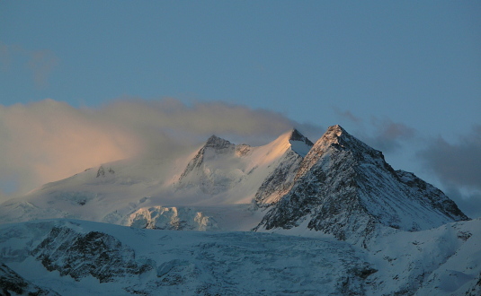 20.04.08: Wir starten früh; bald geht die Sonne auf über Riedgletscher und Nadelhorn . | |