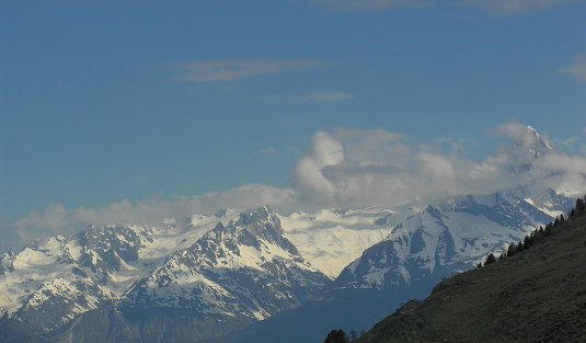 12.05.08: Auch über dem Bietschhorn hängen Wolken . -> Der Gipfelhang vom Galenhorn hat nicht mehr sehr viel Schnee . -> | |