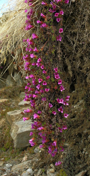 12.05.08: Gegenblättriger-Steinbrech hängt über eine Weg_Kante herunter . | |