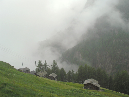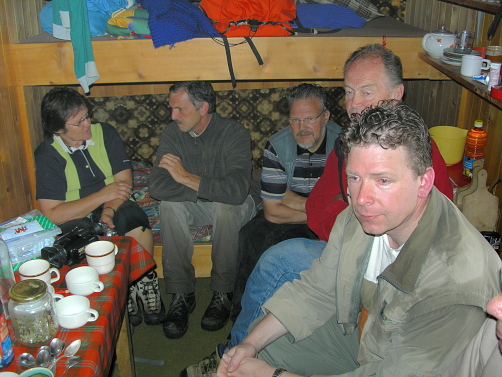 Die Vorhersage für diesen Tag war einigermassen gut, so wollen wir von Embd aus zu unserem Schalbhüttji laufen. Wir , das sind 2 Australier, 6 Niederländer und Volkher & Rosmarie . Trotz Regenwetter ist es drinnen warm und gemütlich. |