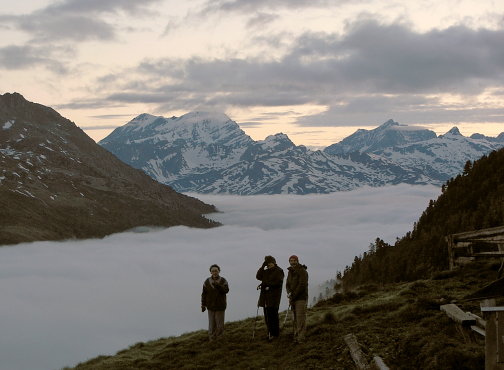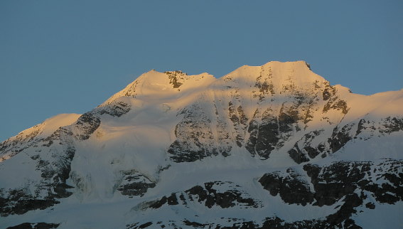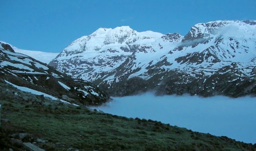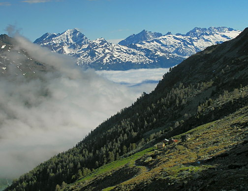 08.06.08: Ueber Nacht hat es aufgeklart; wir sind über dem Nebelmeer ! da können wir nicht im Bett liegen bleiben, -> 04:50 aufgestanden ! Im Süden Diablon, im Norden Balmhorn und das Rhonetal . |