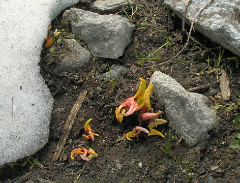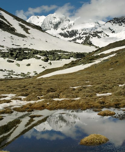 08.06.08: Dann treten wir den Rückweg über den Stausee an. Am Nachmittag kommen mehr und mehr Wolken auf . -> So bald der Schnee geschmolzen ist , kommt der Alpen-Ampfer hervor . | |