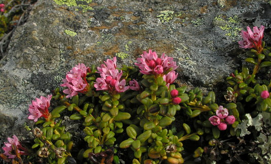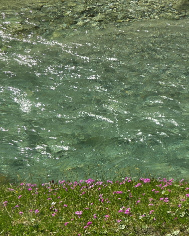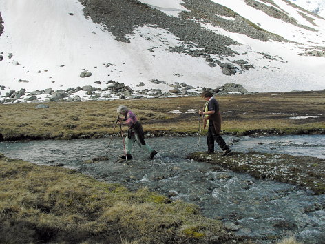 08.06.08: Alpen-Azaleen an Felsblöcken . An flachen Stellen überqueren wir die Arme des Brändji_Bachs . | |