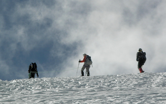 25.07.08: Mit Steigeisen und angeseilt sind wir im Aufstieg, es ist windig, doch dann kommen wir in die Sonne ( Foto: Bart K. ) | |