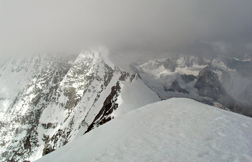 25.07.08: Endlich oben auf dem Bishorn ( 4135 m) . Die Nachbargipfel sind von Wolken verdeckt . |