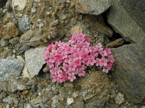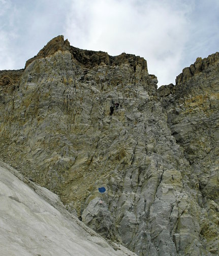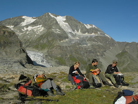 11.08.08: Weiter hinauf durchs Gässi auf die Moräne . Schon sind einige Gruppen unterwegs aufs Bishorn . | |